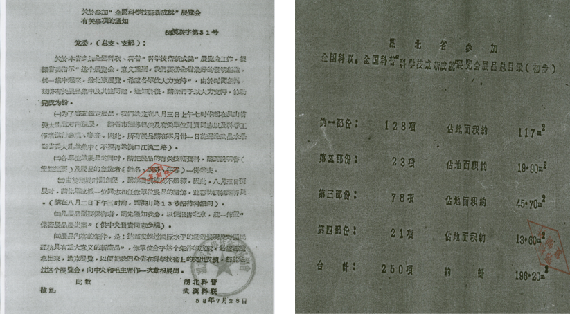 1959年,湖北省科协组织全省广大科技工作者参加全国科联、全国科普“科学技术新成就”展览会,向党中央和毛主席作一次汇报展出。展示的成果中,我省达到或者超过国内外先进水平的科学技术成果250项,有10余项科技成果为国际首创。