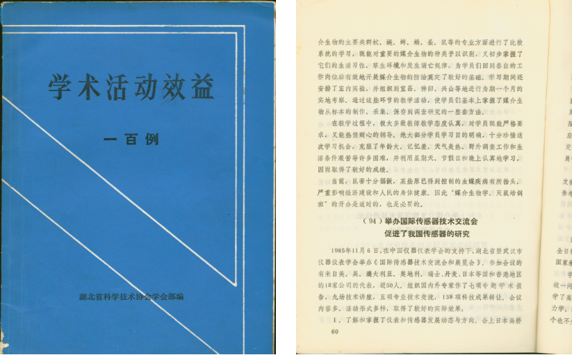 1985年11月6日,湖北省仪器仪表学会在全国学会的支持下,在武汉举办了《国际传感器技术交流会和展览会》,参加会议的有来自美、英、日等发达国家和地区的18家公司的代表,完成了138项科技成果转让,取得了较好的实效,并延伸扩大了会议的科学效益和社会效益。通过交流,使国内同行了解和掌握了代表世界先进技术水平的日本仪表和传感器发展动态与方向;了解到美国等最新相关产品的先进工艺和材料情况,促进了国内学、展、技、转、贸相结合;会议提供的论文、译文资料、产品样本、成果简介等资料的类别近50种,为国内同行及企业提供了重要的技术、学术参考。