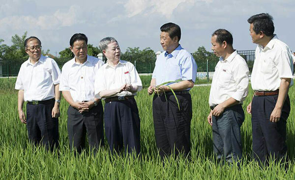 2013年7月22日下午,习近平总书记专程到湖北省鄂州市鄂城区杜山镇东港村育种基地看望朱英国院士。在育种基地,习总书记拔起一棵稻苗察看分蘖情况,夸奖“很壮实”。听说武汉大学朱英国院士负责培育的杂交稻良种累计推广亿亩以上,总书记说:“您辛苦了,感谢你们作的贡献,希望继续努力。粮食安全要靠自己。”