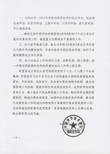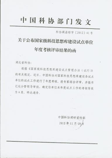 2011年至2013年,中国科协组织专家对全国各省级科协“国家级科技思想库建设试点单位”进行考核,湖北省科协连续三年参加考核,成绩均排在各参加考核单位的首位。