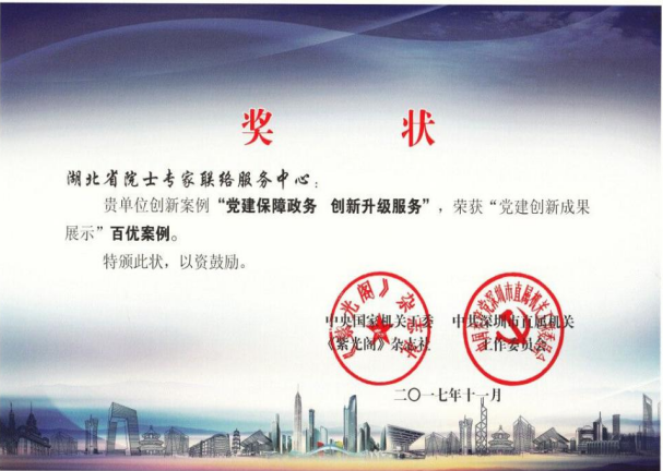 2017年11月21日,湖北省院士专家联络服务中心党支部推送的党建工作创新成果案例,荣获由中央国家机关工委指导、《紫光阁》杂志社与深圳市直机关工委联合主办的“党建创新成果展示”活动评选的全国党建工作创新“百优案例”奖,该中心还荣获2017年全国人才工作创新最佳案例奖、湖北省直机关工委“红旗党支部”荣誉称号。