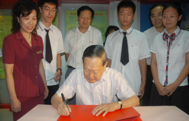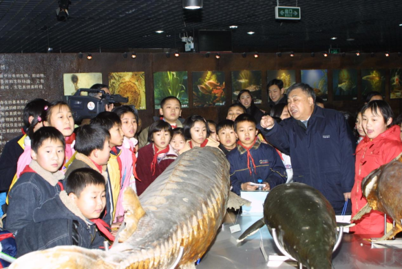| 杨振宁先生为华师一附中学生科学院题词 | 中国科学院曹文宣院士在水生生物博物馆给小朋友进行科普 |