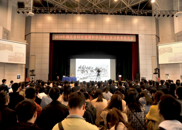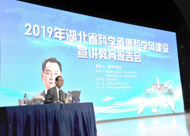 2019年10月29日,湖北省科学道德和学风建设宣讲报告会在华中科技大学韵苑体育馆举行。中国科学院院士、华中科技大学同济医学院附属同济医院外科学系主任、肝胆胰外科研究所所长陈孝平作宣讲报告,省科协党组书记、副主席叶贤林致辞,省教育厅党组成员、副厅长黄国斌主持报告会,中科院武汉分院党组副书记、纪检组组长蔡长塔,华中科技大学副校长解孝林和省社科院有关领导出席报告会。
