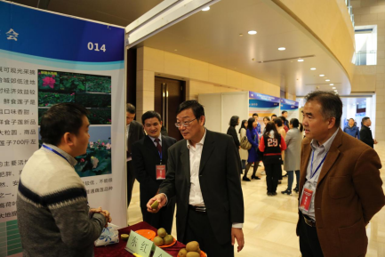 | 省科协党组书记叶贤林与华中科技大学项目专家团队的科研人员亲切交谈 | 省科协党组书记叶贤林在湖北省植物学会展台前详细了解新品猕猴桃的栽培技术 |
