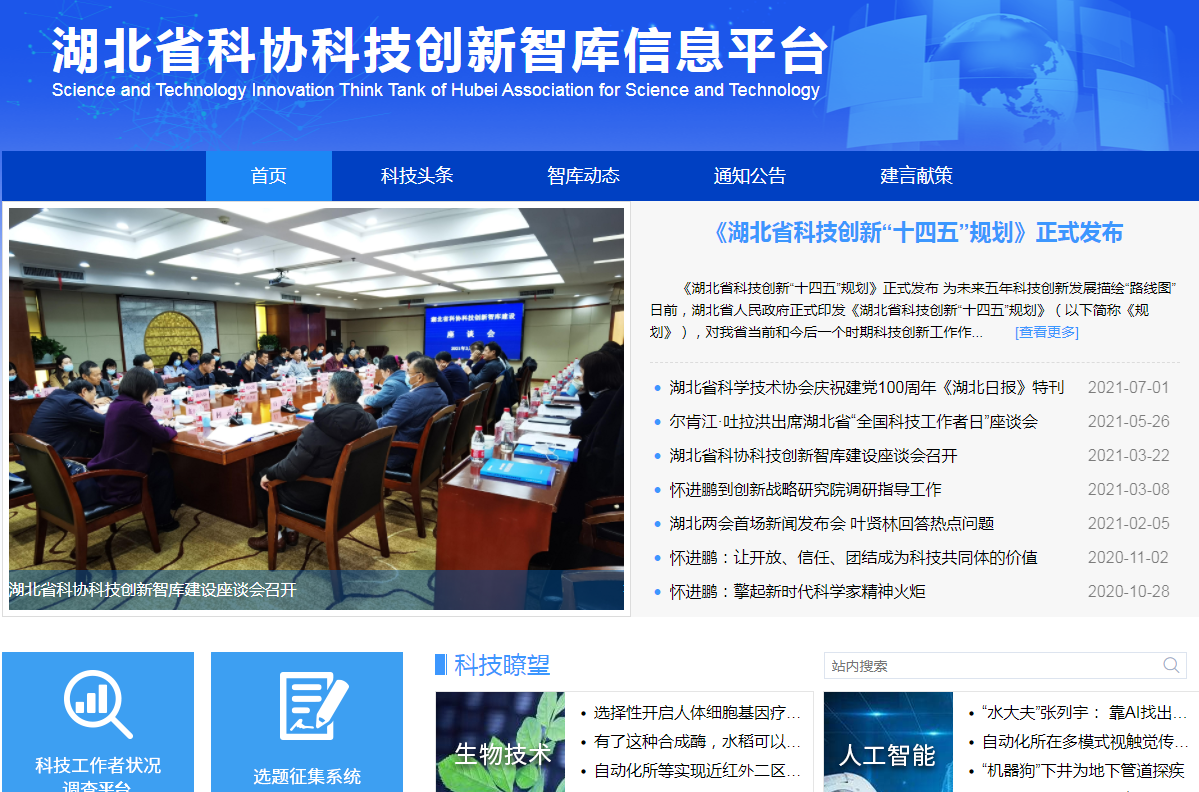 2019年1月,根据新形势下服务我省科技创新,加快推进科技强省建设的指导思想,按照省科协深入推进“互联网+科技 ”建设要求,对“中国科协科技思想库湖北分库信息平台”进行全新改版升级,搭建完成“湖北省科协科技创新 信息平台”。