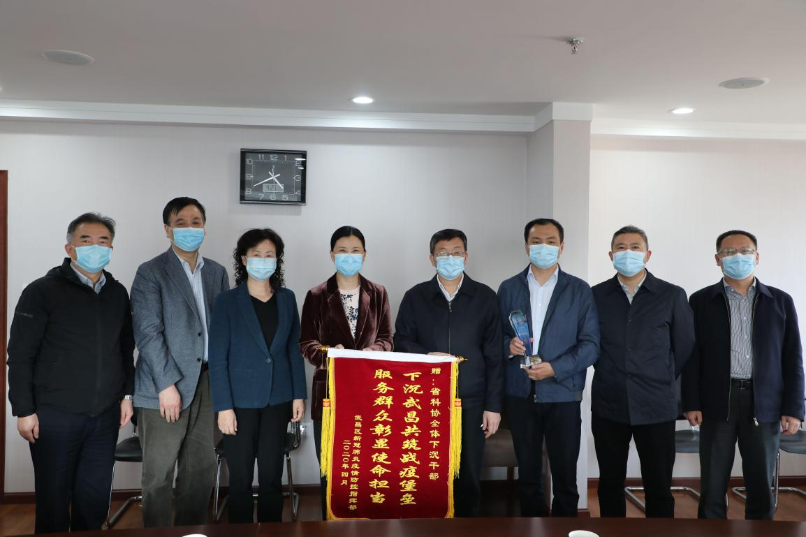 2020年4月24日,武昌区委书记刘洁、区长余松一行代表武昌区新冠肺炎疫情防控指挥部,专程到省科协赠送“下沉武昌共筑战役堡垒,服务群众彰显使命担当”锦旗,感谢省科协在新冠肺炎疫情肆虐之际挺身而出,积极支持和参与武昌区防疫工作,为武昌区坚决打赢疫情防控阻击战贡献了科协力量。