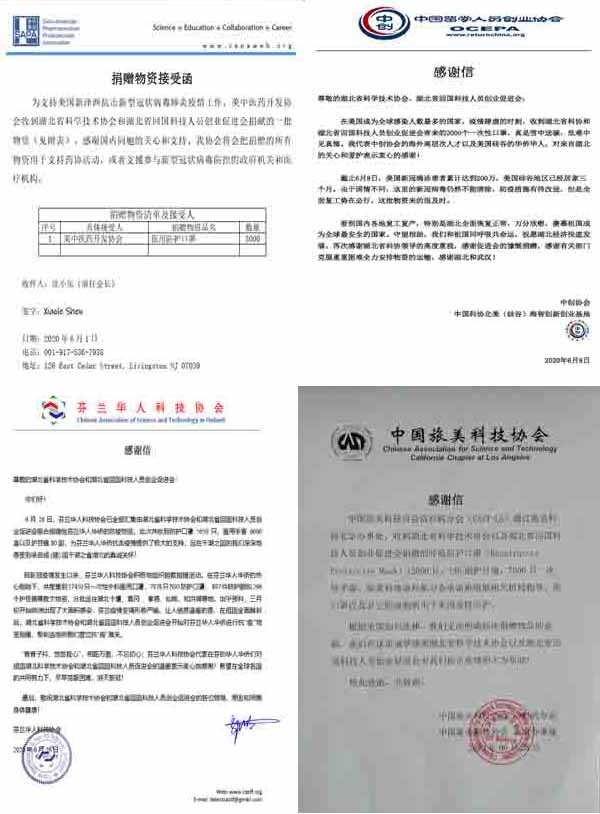 中国旅美科技协会、芬兰华人科技协会、美中医药开发协会和中国留学人员创业协会(美国)先后发来感谢信,信中表达了对来自中国湖北的真诚关怀和帮助的感谢之情。